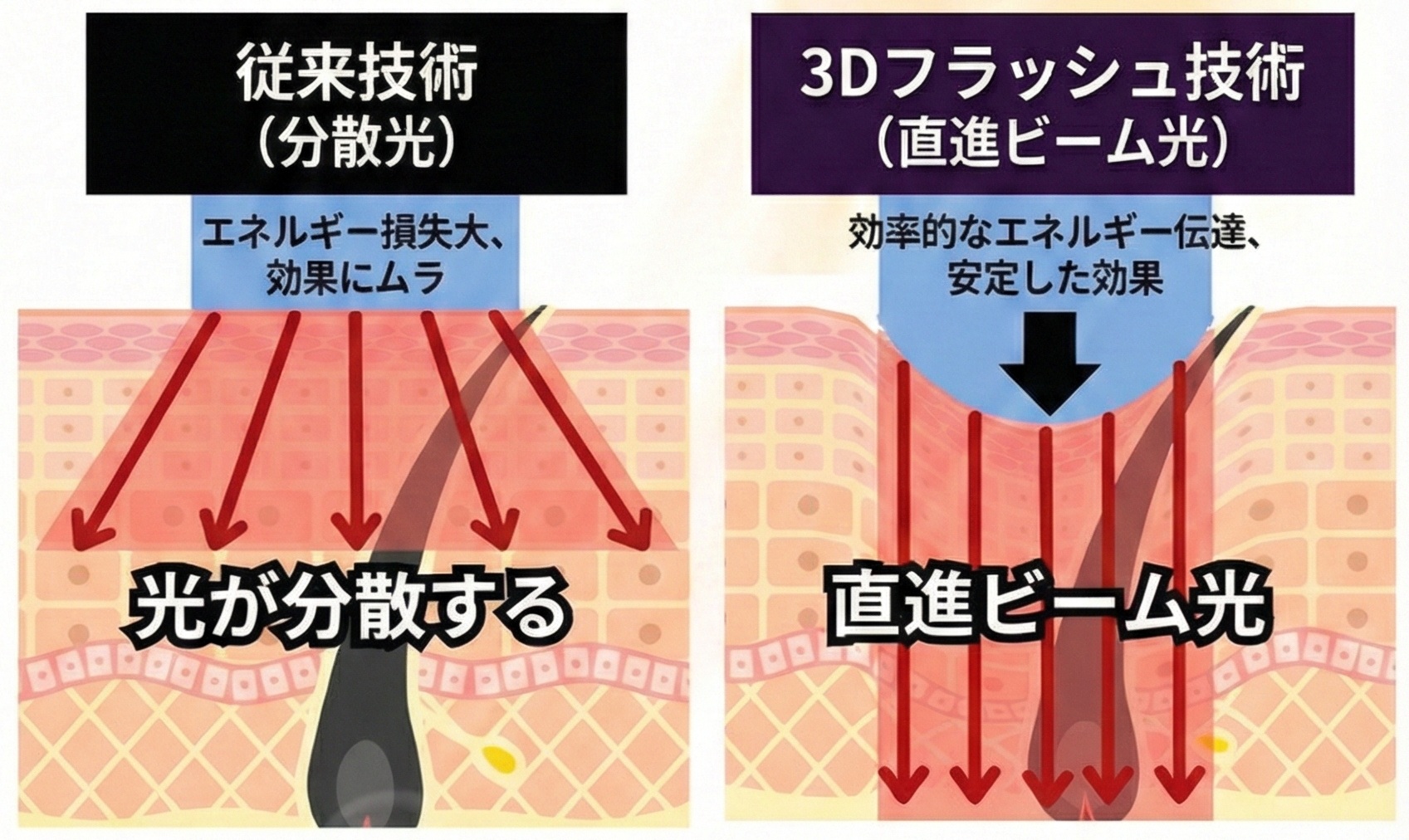 従来の平面ヘッドは、肌に当てた時に光が横に拡散して逃げていました。3Dフラッシュは光をギュッと集めて「直進ビーム」に変えます。