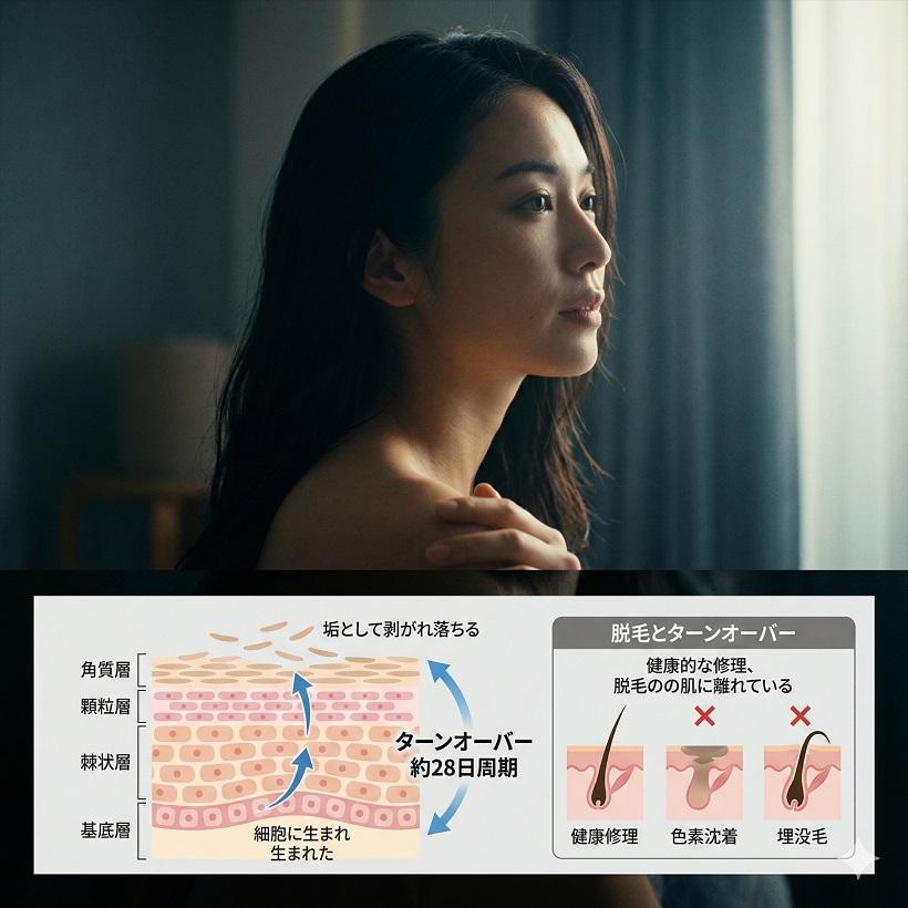 脱毛施術とターンオーバーの関係は、主にアフターケアと肌コンディションの観点から重要です。脱毛後の肌は照射による熱ダメージを受けているため、ターンオーバーが正常に機能していれば自然な修復が進みやすくなります。逆にターンオーバーが乱れていると、炎症後の色素沈着が残りやすく、肌荒れが長引くリスクが高まります。